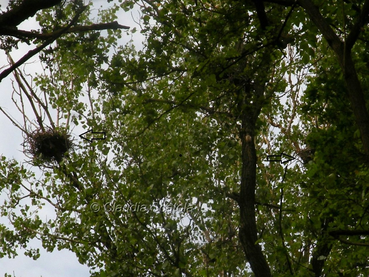 Un particolare della garzaia, la "città degli aironi". Nell'immagine due dei numerosi nidi (frecce) presenti nell'area di nidificazione dell'oasi.