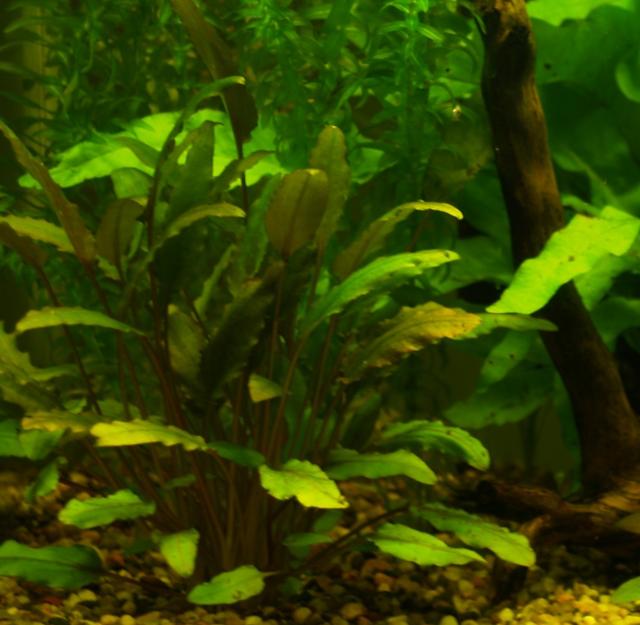 Queste piante palustri associano all'aspetto decorativo del fogliame, la caratteristica di ancorarsi nel fondo con radici robuste e ben sviluppate, aspetto che non ci sentivamo di trascurare in un acquario nel cui fondo era stato inserito terriccio da giardino. La rizosfera che presumibilmente si sarebbe andata a creare intorno alle radici rappresenta l'ambiente aerobico idoneo all'instaurarsi dell'attività batterica indispensabile alla degradazione del materiale organico in forma disponibile ad essere assorbito dalle radici delle piante. Inoltre il cultivar della Tropica a fogliame marrone ci sembrava potersi inserire molto bene in un arredamento basato pressoché esclusivamente su elementi naturale. La colorazione non omogenea delle foglie ellittiche a margine ondulato dove marrone e verde si fondono in sfumature più o meno evidenti, talvolta conferendo un aspetto marmorizzato andava a richiamare il colore del legno posto in posizione centrale rendendo il tutto molto godibile.