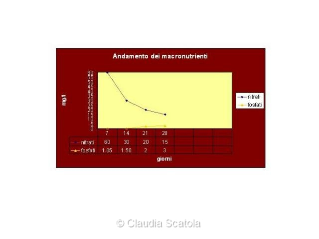 Anche la concentrazione del fosforo si è mantenuta elevata a lungo e su livelli molto alti ed impensabili in "normali" acquari. Tuttavia, questa disponibilità, non ha mai scatenato la proliferazione di alghe verdi filamentose non ramificate come quelle appartenenti al genere Oedogonium, caratteristiche, in particolare modo, durante le fasi di avvio di molte vasche. La ricerca e l'esame al microscopio avevano messo in evidenza anche un'"insolita" assenza di quei protisti fotosintetici che normalmente si accompagnano a tipologie di vasche certamente più comuni. Nessuna presenza di alghe rosse si è mai dovuta registrare. Questa tipologia algale è sempre stata completamente assente. Altri assenti importanti erano i cianobatteri. La ricerca ha prodotto solo dei risultati in concomitanza del filtro appeso a zainetto, dove qualche filamento di Oscillatoria princeps è stato messo in evidenza intorno al sesto mese. Ma oltre qualche sporadico filamento nella zona dove l'acqua ritornava nell'acquario formando una piccola cascatella non si sono potuti rinvenire da nessuna altra parte. La disponibilità di CO2 è sempre rimasta su livelli tali da garantire una buona crescita delle piante presenti e tale da non far rimpiangere la mancanza di apposito impianto d'erogazione della stessa. Se l'apporto in macronutrienti e in CO2 si è rivelato non necessario, non altrettanto si è potuto dire per quanto concernente i micronutrienti, la cui assenza o bassa presenza ha suggerito sin da subito la necessità di un apporto esterno che fosse adeguato alle esigenze di crescita delle piante ospitate.
